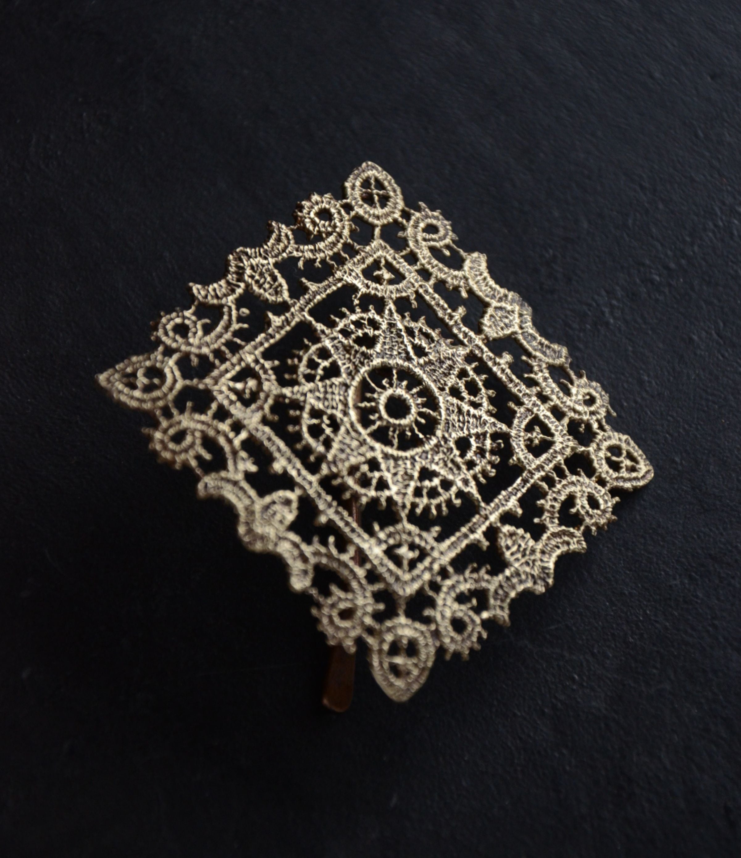 大ぶりなレースモチーフはシンプルなまとめ髪を一気に華やかにしてくれます。秋冬のコーディーネートのアクセントにもなりそうです。まとめた髪のヘアゴムに差し込んで使用するヘアフックです。付け外しも簡単にできて、結び目隠しにも使えます。