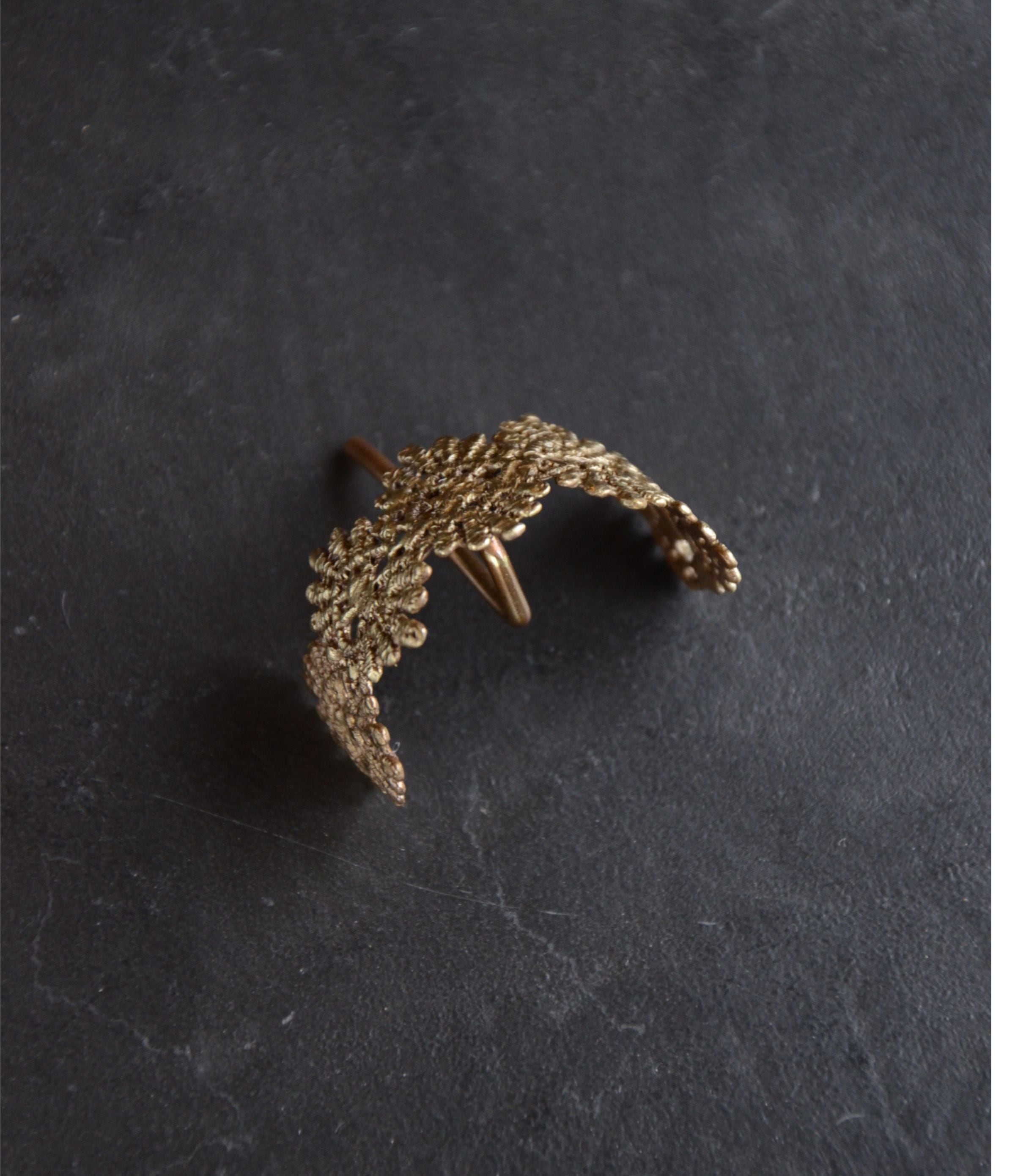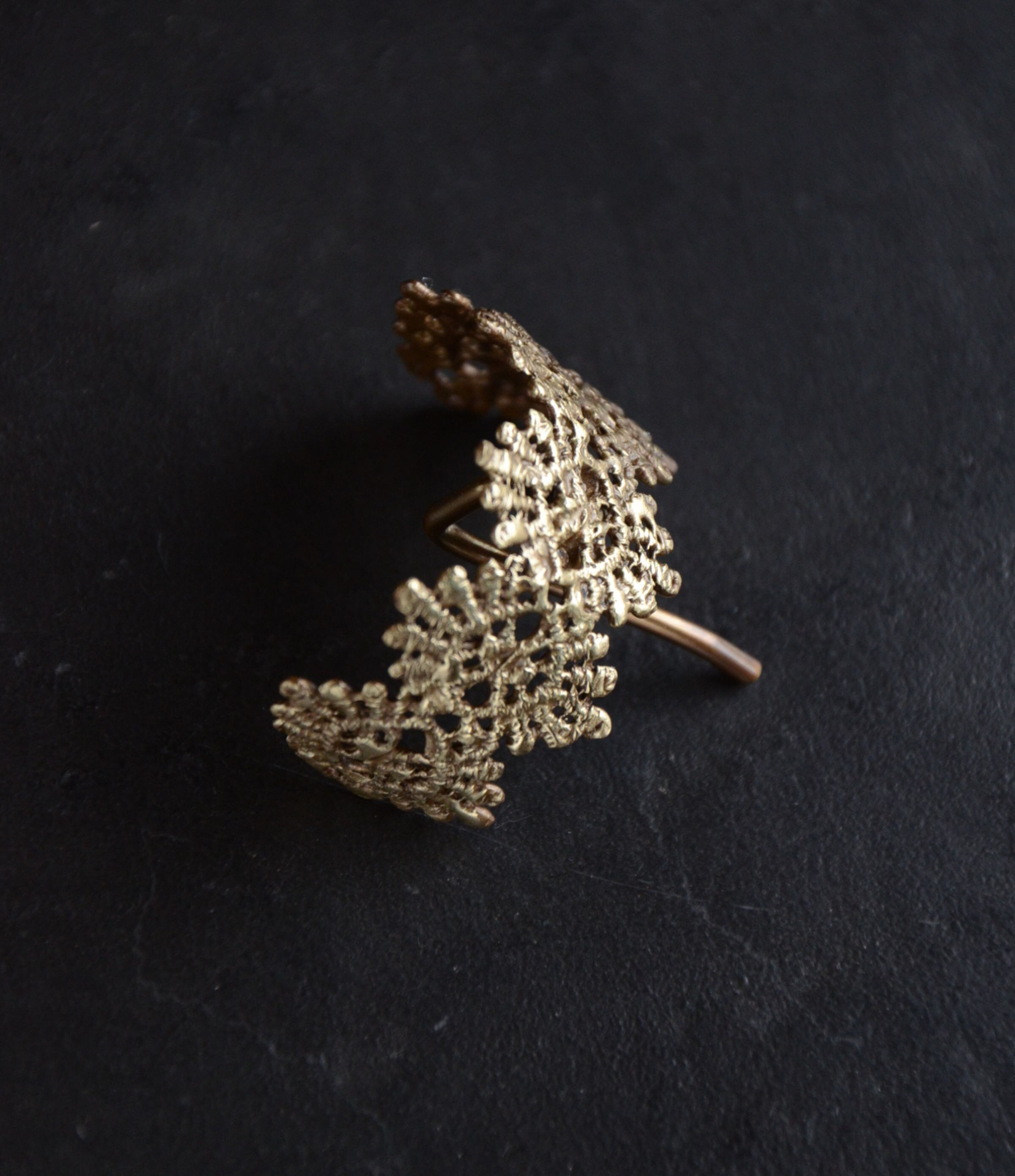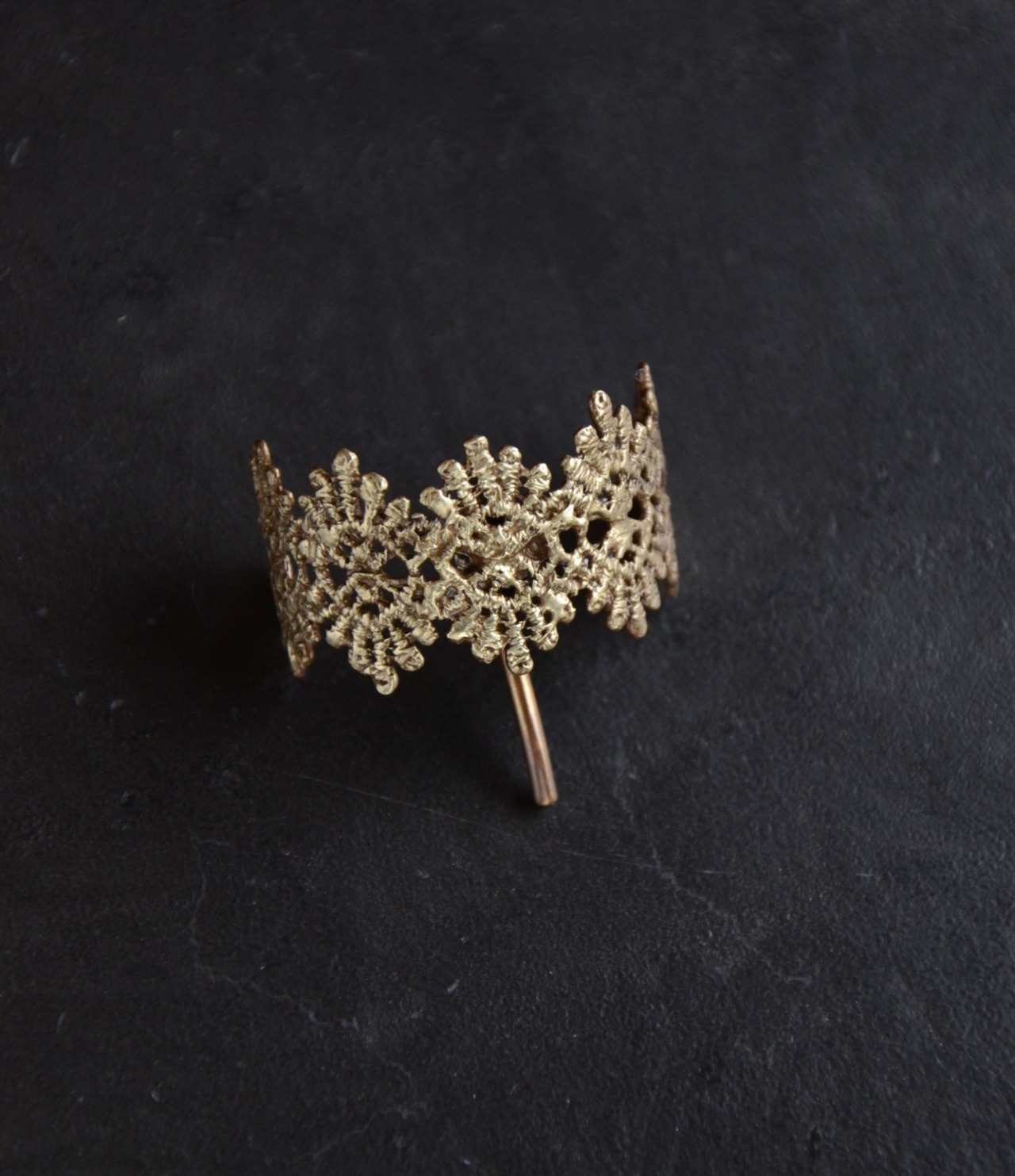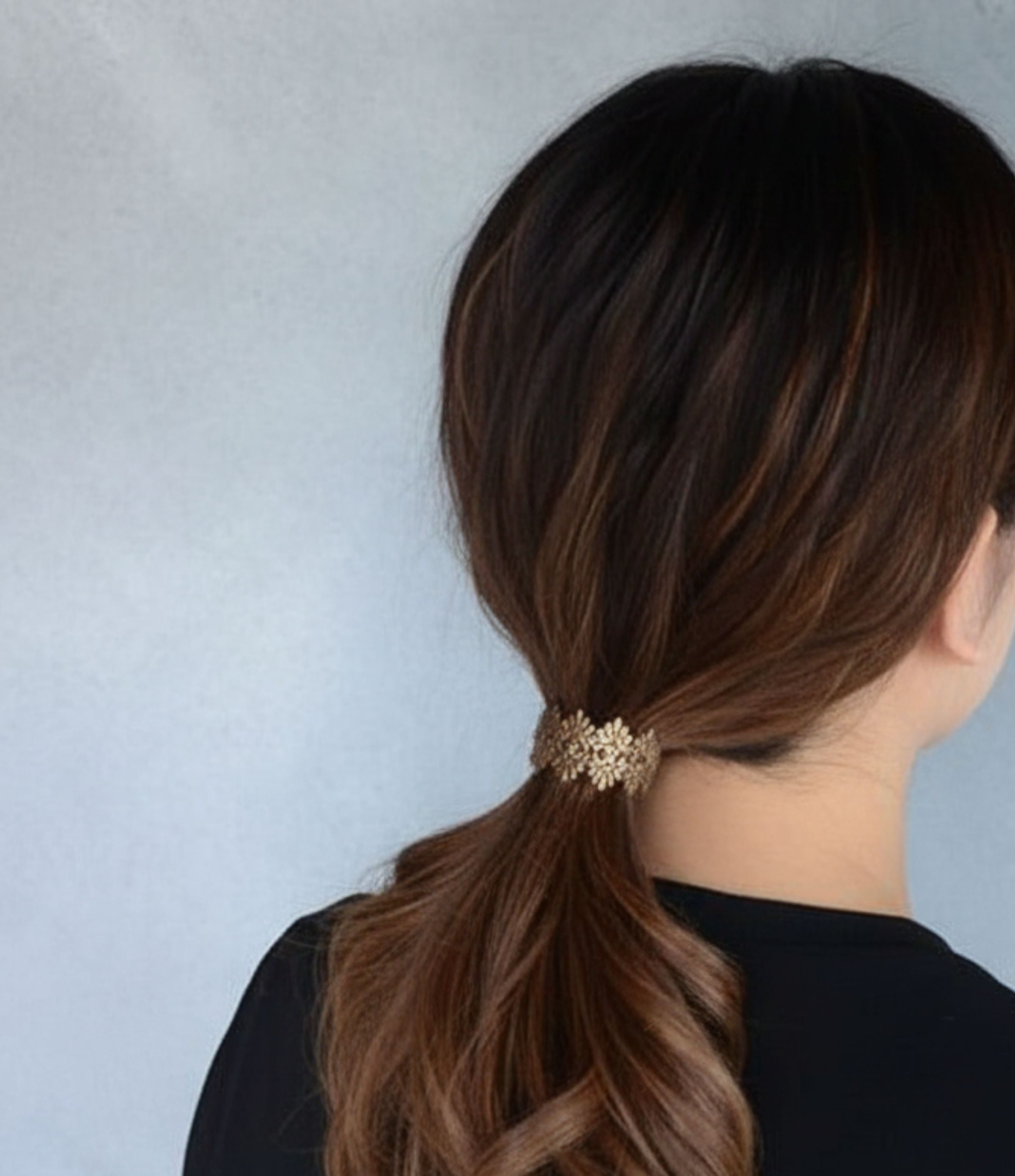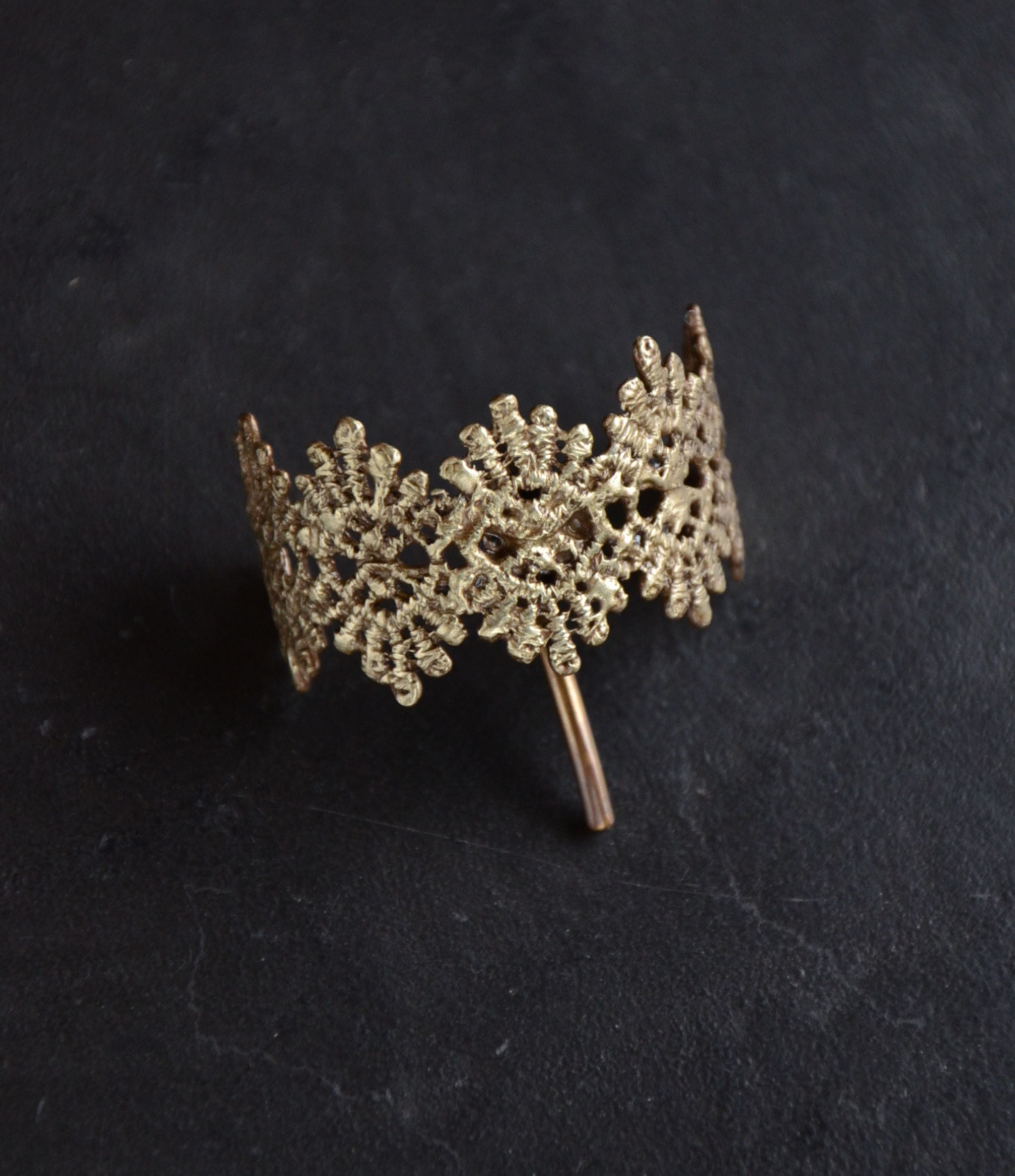 レースを繋いだモチーフにカーブをつけて仕上げました。一つ結びをした結び目にぴったりなデザインです。まとめた髪のヘアゴムに差し込んで使用するヘアフックです。付け外しも簡単にできて、結び目隠しにも使えます。