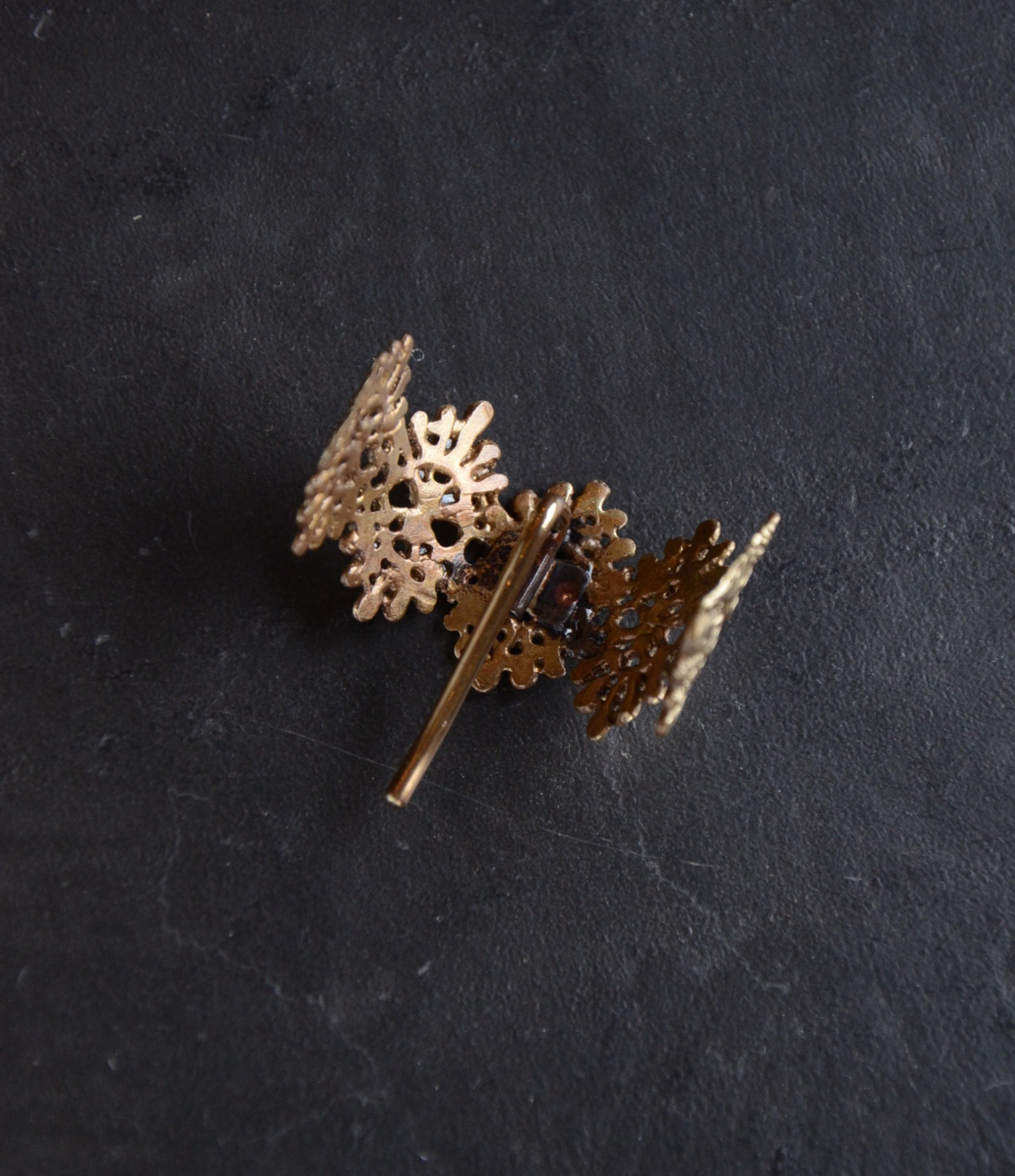 オリジナルの真鍮のパーツは一度黒く燻してから磨きをかけ、アンティーク風で落ち着いた印象になるよう仕上げています。真鍮パーツには酸化による変色を防ぐためクリアコーティングを施してあります。