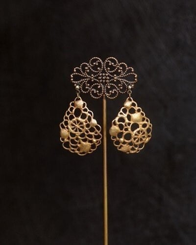 丸やレースを繋げて、花びらのような形に仕上げました。平らではなくふっくらと丸みをつけてあるので、揺れると軽やかな印象です。大ぶりですが透け感があるので着けやすいデザインです。