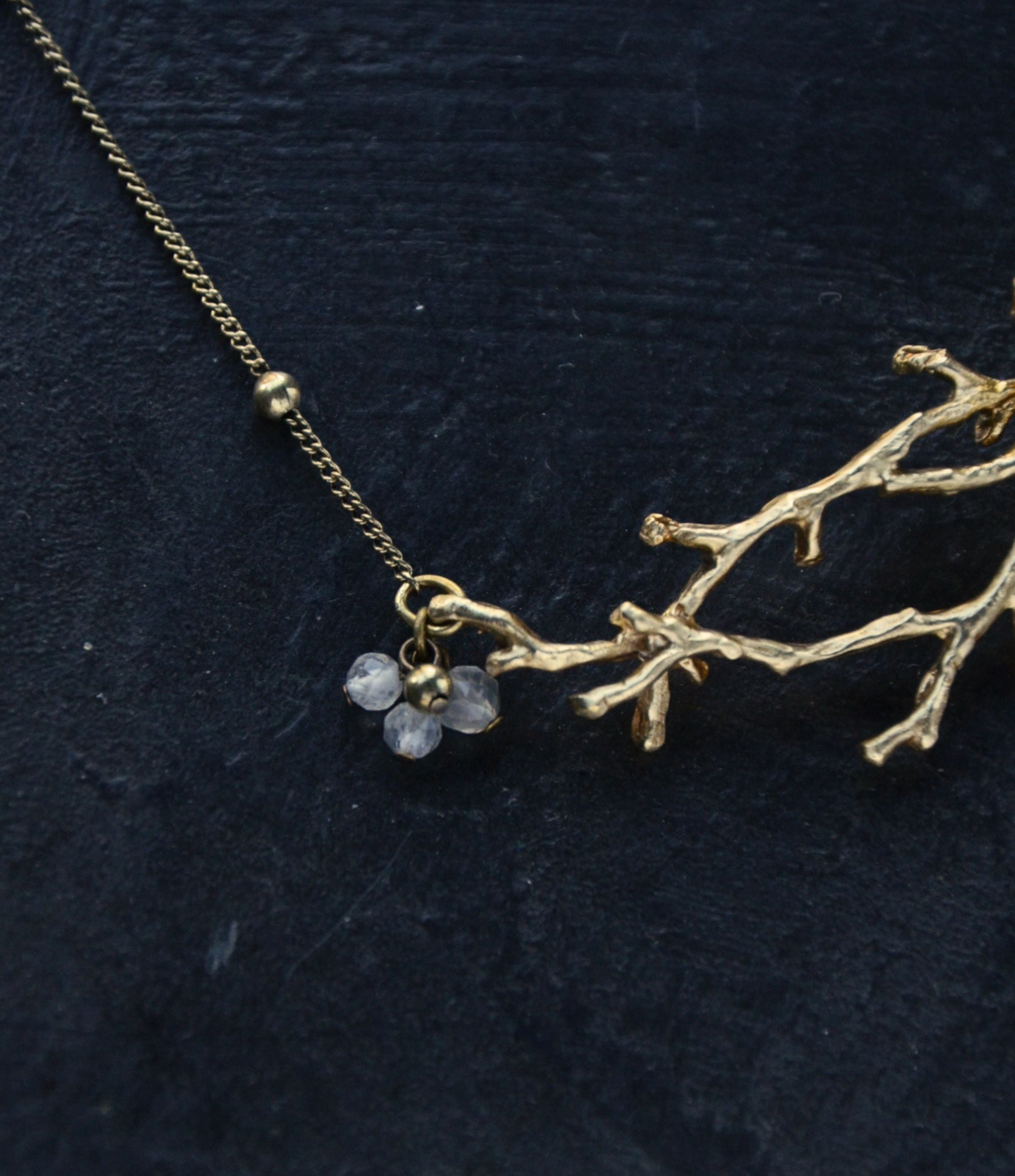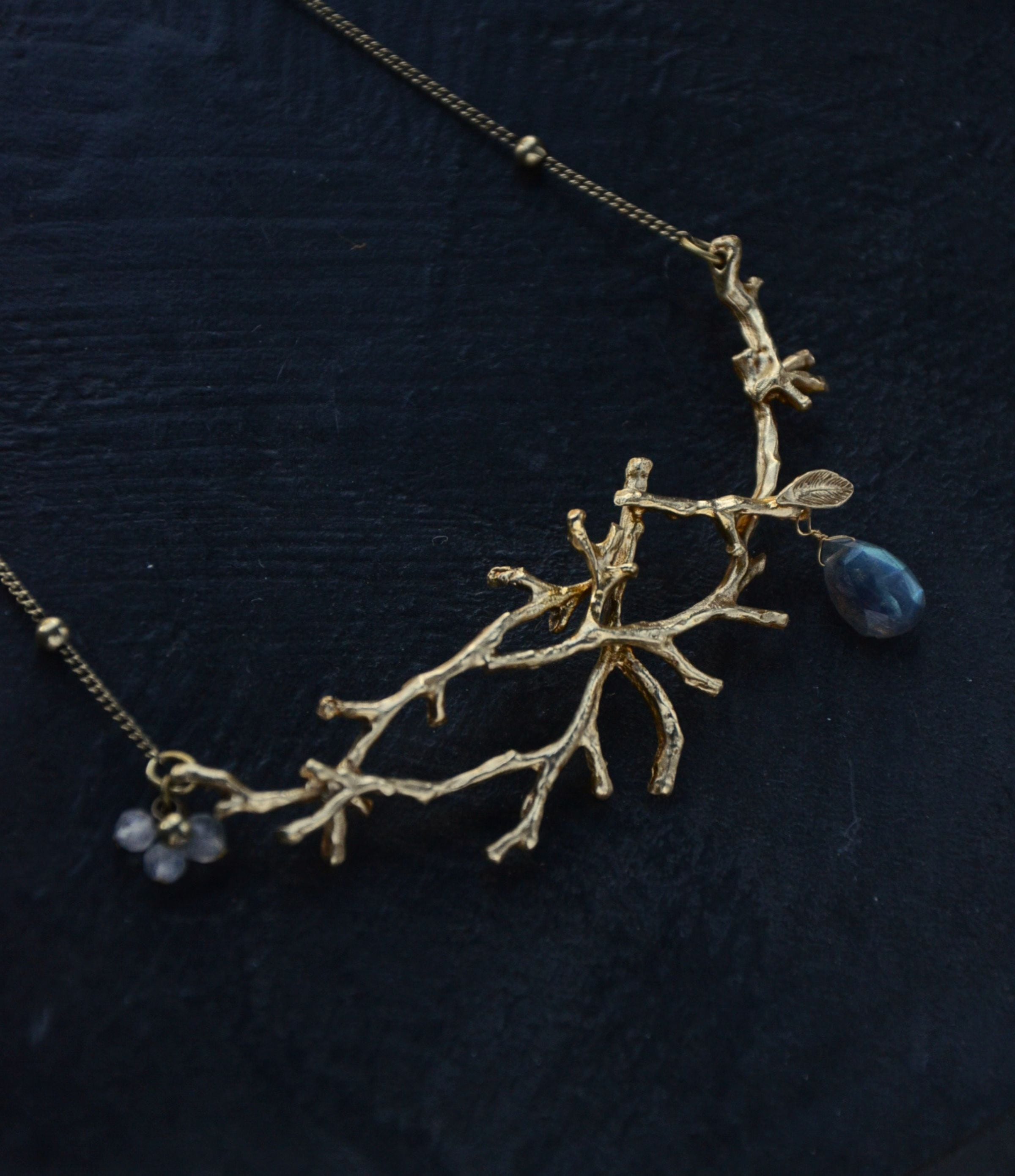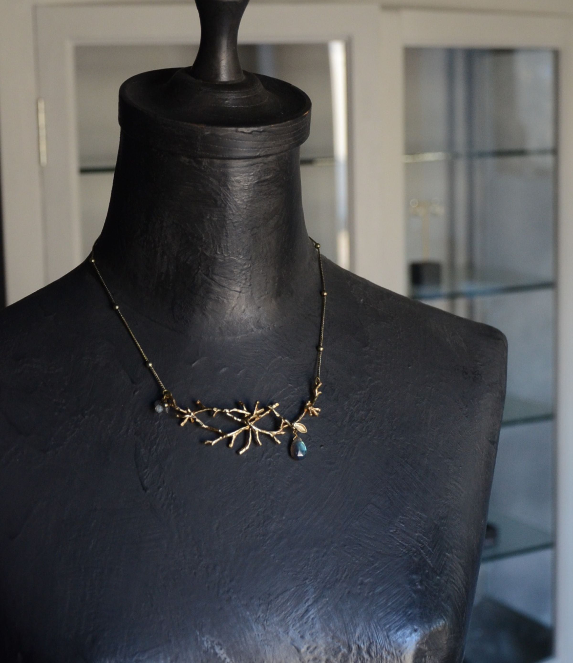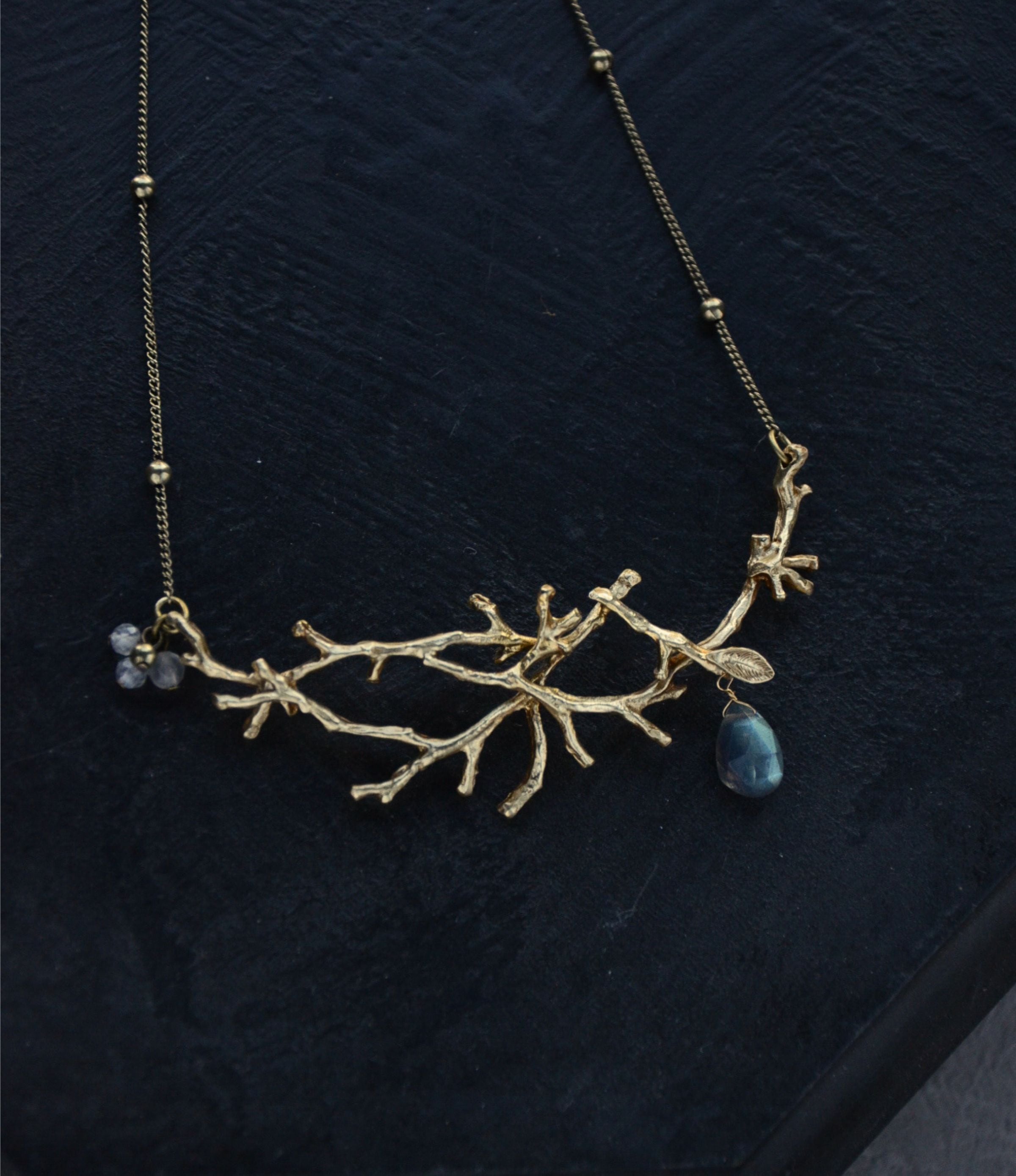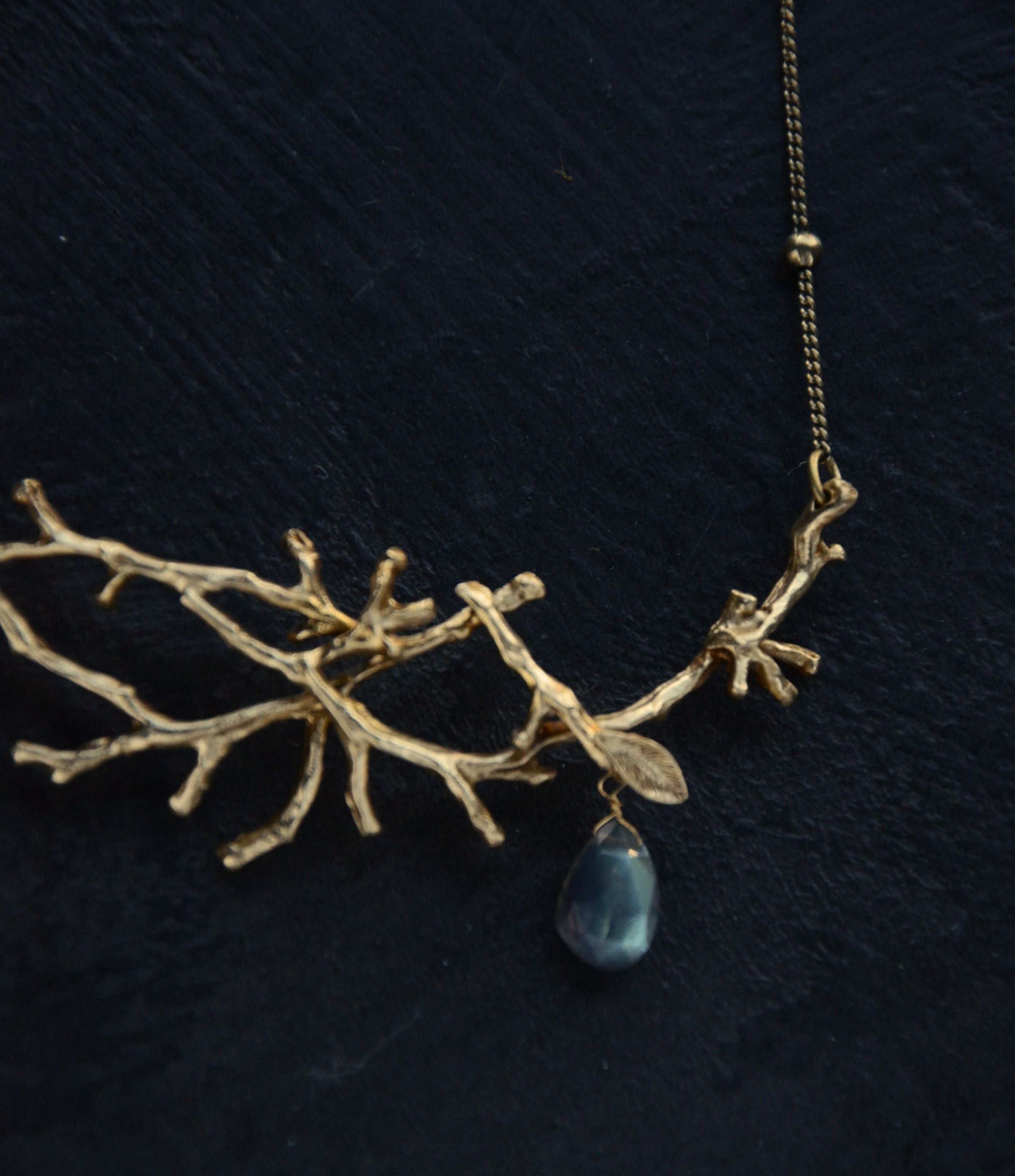 本物の小枝から型を取り、真鍮で存在感のあるネックレスに仕上げました。木枯らしが吹き、落ち葉が舞い散る… そんなイメージで作ったネックレスは一枚の葉っぱと、果実のように下がる天然石がポイントです。